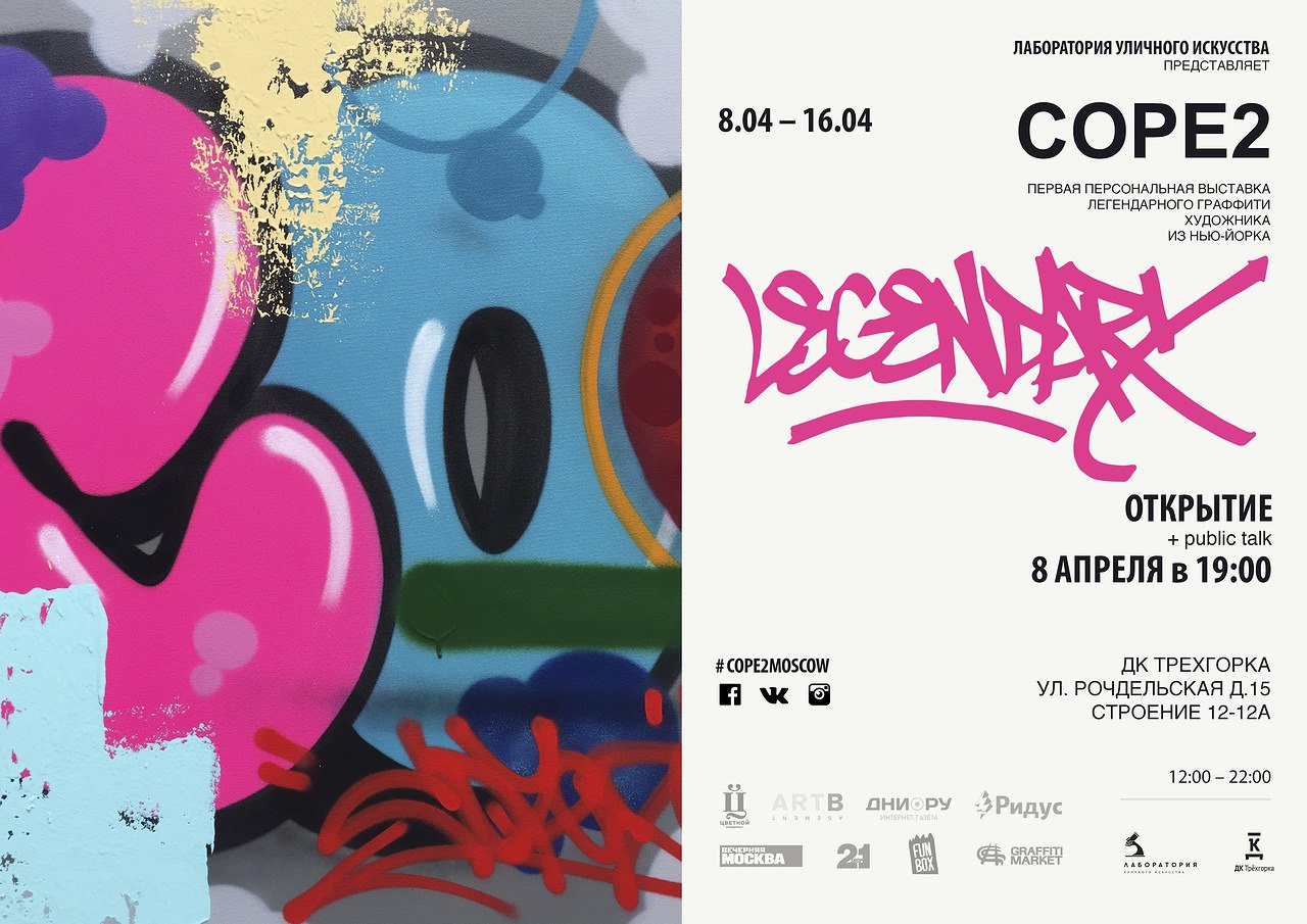 Весной в Москве состоится знаковое событие для поклонников работ культового нью-йоркского художника Фернандо Карло, более известного как COPE2. 8 апреля в 19:00 на площадке ДК Трехгорка откроется первая персональная выставка «Legendary». Поклонники уличного искусства смогут не только оценить картины известного граффити-райтера, но и лично познакомиться с COPE2. В формате public talk каждый желающий сможет задать знаменитому художнику интересующий вопрос на любую тематику. Выставка организована проектом «Лаборатория уличного искусства».