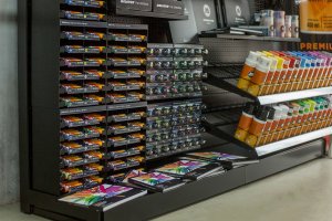 И на сладкое - маленький стенд ONE4ALL. Он может располагаться как на витрине, так и быть повешен на стену. В него входят только маркеры 127HS, 227HS и 627HS, основные цвета заправок 180 и 30мл и пустые маркеры 611EM, 211EM и 111EM. Стенд оснащен прозрачными дверцами на замке, ваш товар всегда будет в сохранности, но не станет выглядеть из-за этого хуже.