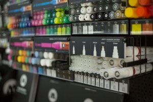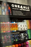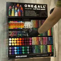 Full Skyline ONE4ALL 2M – в нем на площади 2 метров разместилась вся линейка ONE4ALL в маркерах, наборах, баллонах, заправках, все сменные модули, перья, пустые маркеры, скетчбуки и аксессуары, а так же стенд дополнен линейками LIQUID CHROME и ART MASKING.